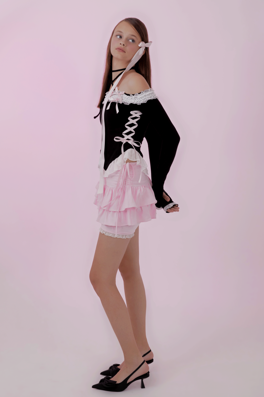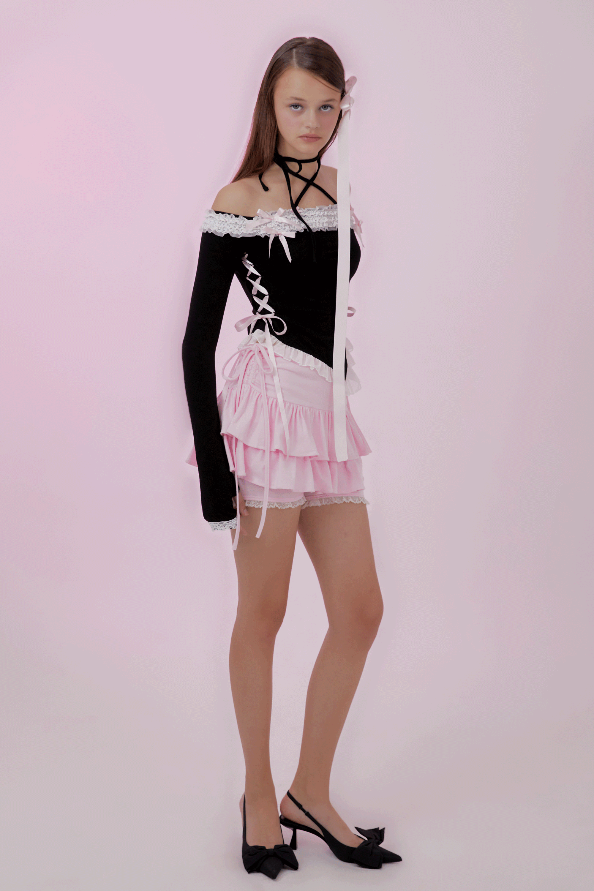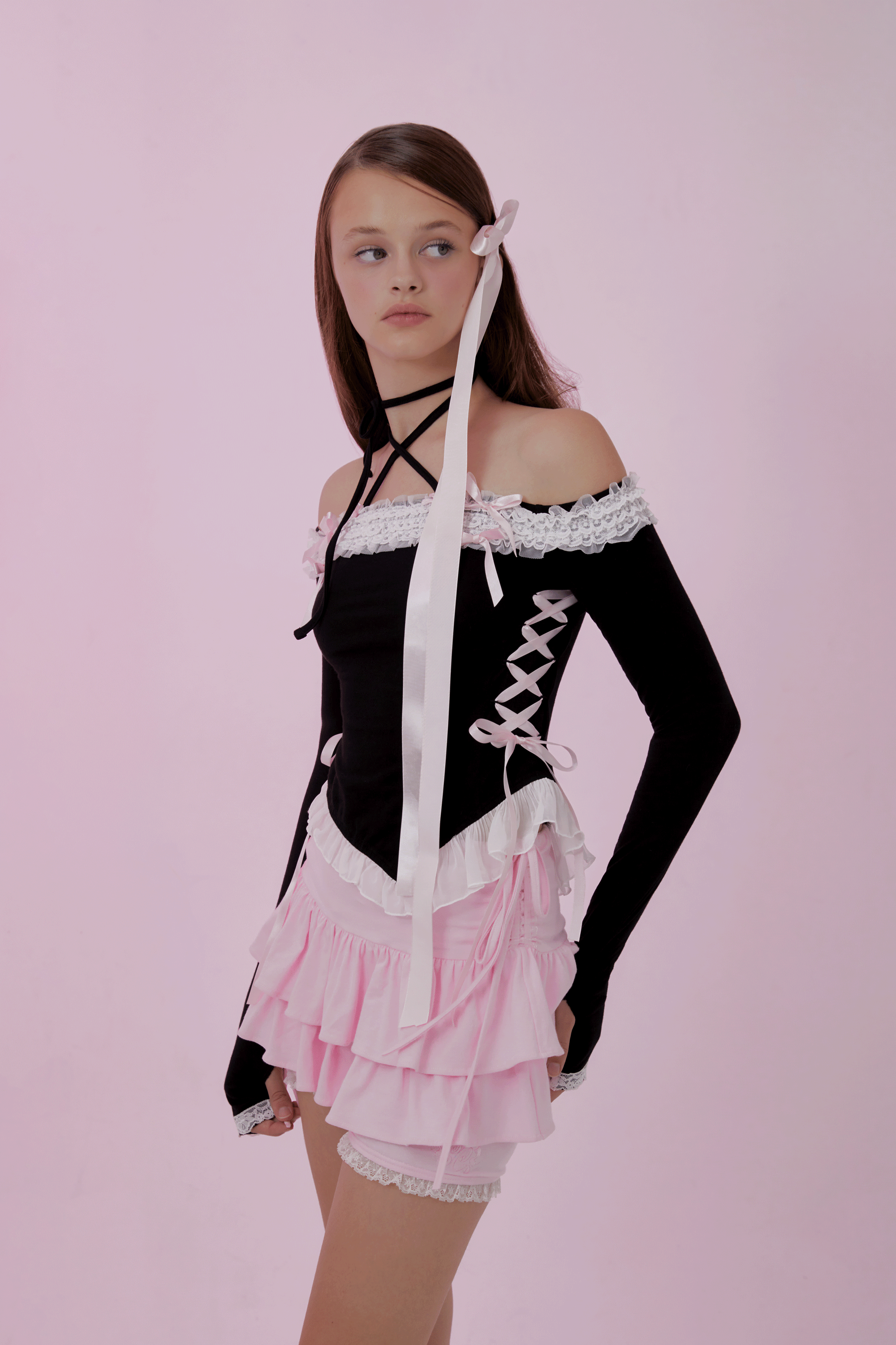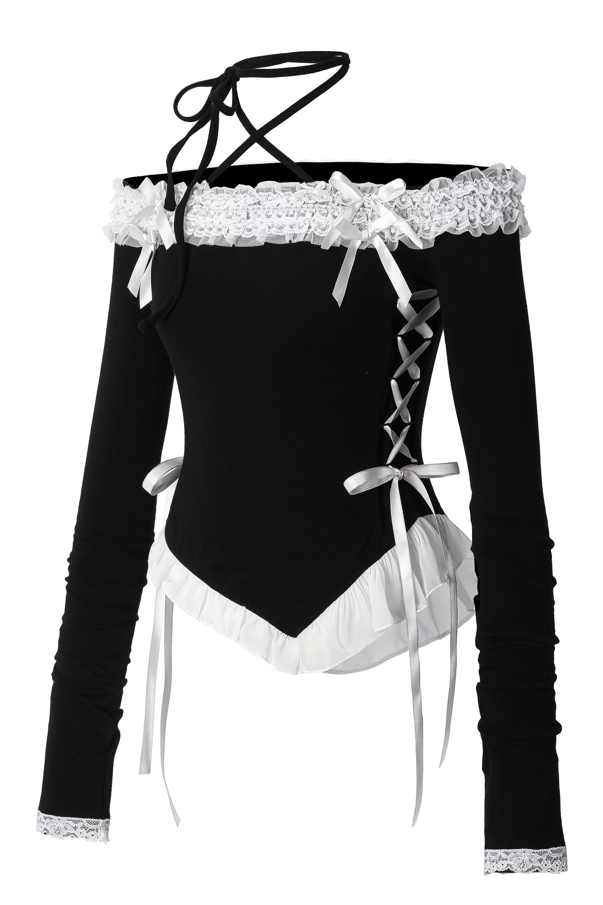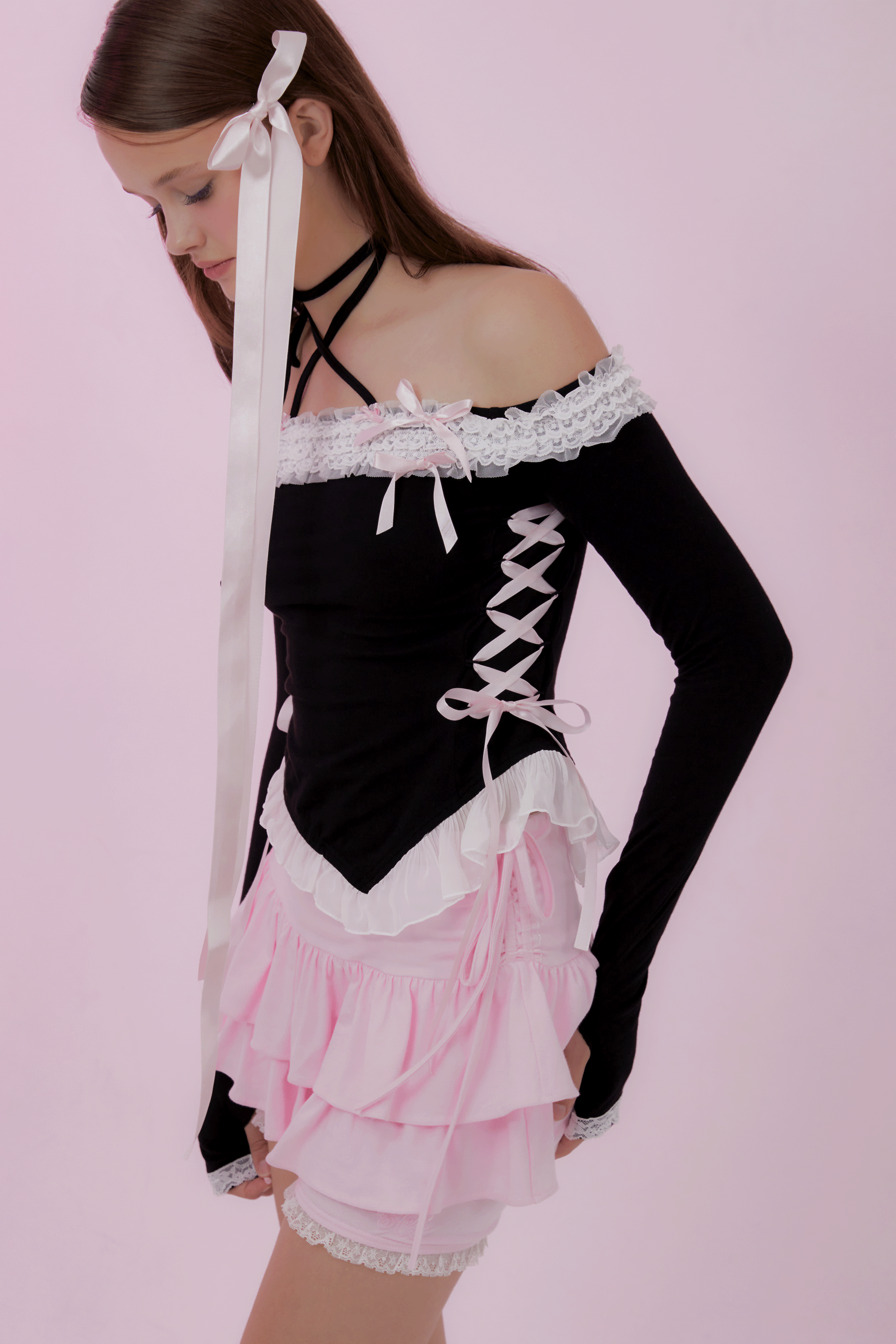 어깨선을 하이얀 레이스가 장식하는 레이스업 오프숄더 탑. 레이스 위에 두 개의 작은 리본과 네 개의 큼지막한 새틴 리본이 달콤함을 더합니다. 긴 기장의 목끈이 있어 x스트랩으로도, 홀터로도 연출하실 수 있습니다. 허리부분의 레이스업 리본은 조절 가능하여 체형에 맞게 연출하실 수 있습니다. 소매는 손등을 덮는 기장으로, 핑거홀이 있어 워머처럼 입어주실 수 있습니다.