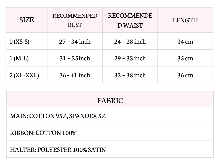 We recommend choosing your size based on your waist ♡ The fabric is stretchy, so it naturally fits your body shape ♡If your bust size is in between, go one size down for a tighter fit,or one size up for a relaxed silhouette ❣️