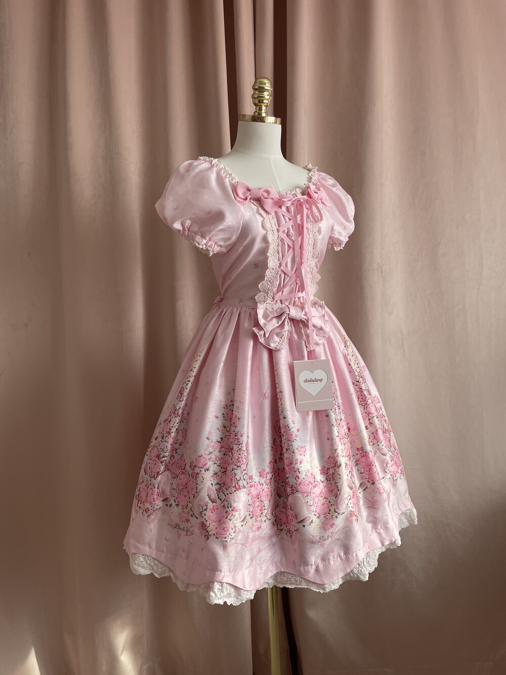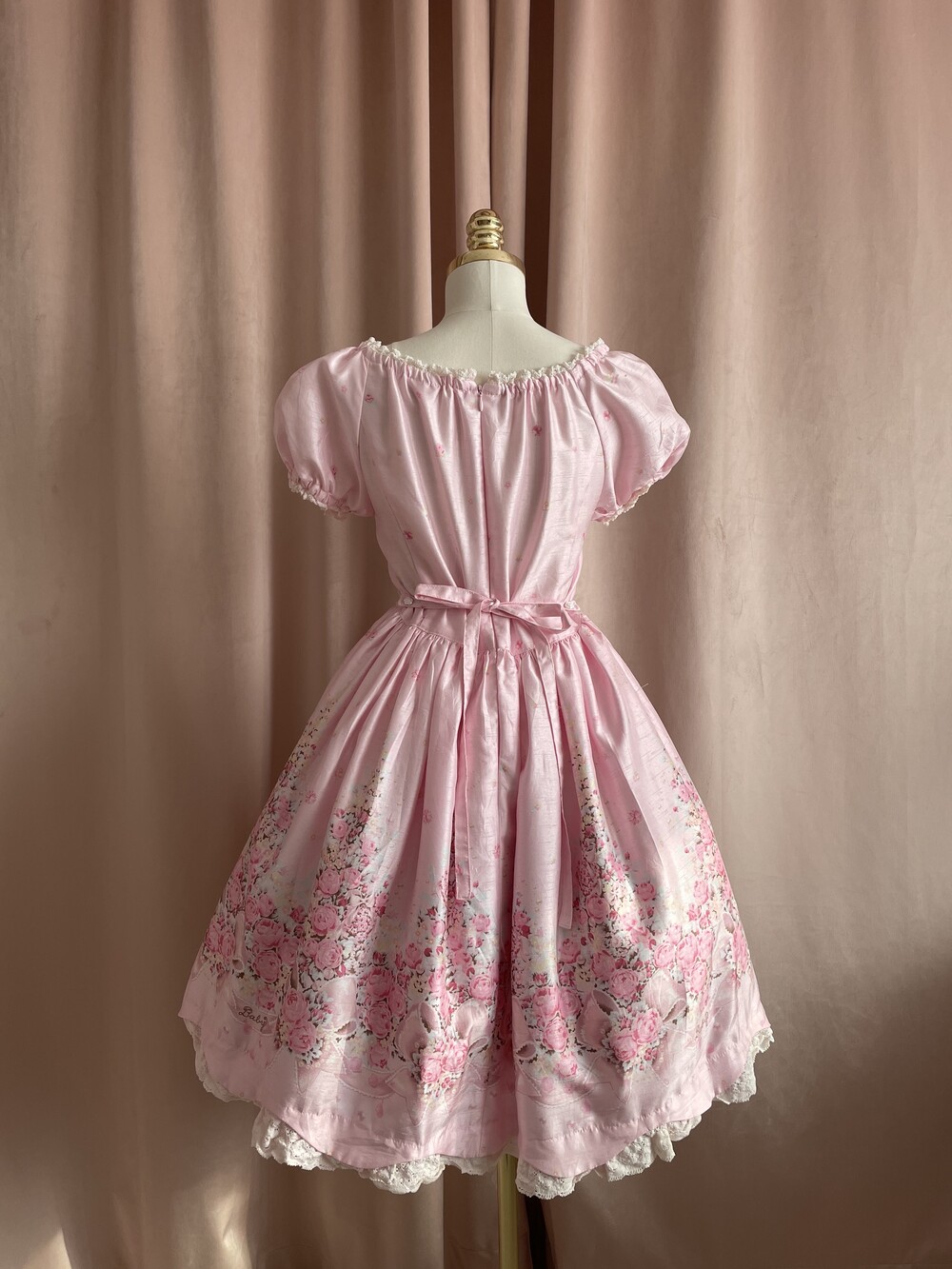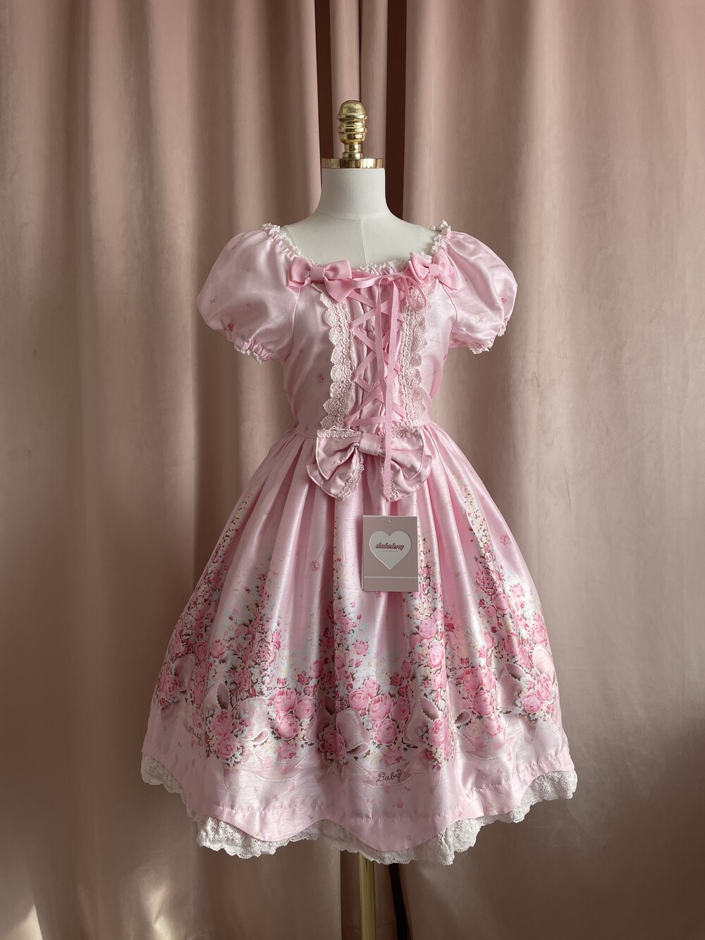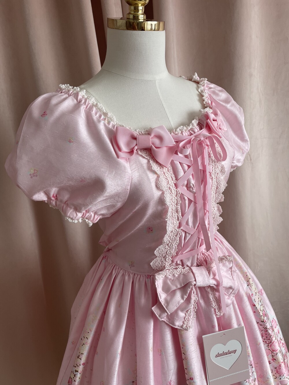 공주 퍼프 소매에 달콤한 로즈 리본 프린팅.